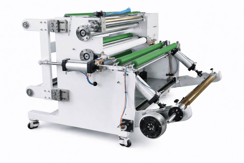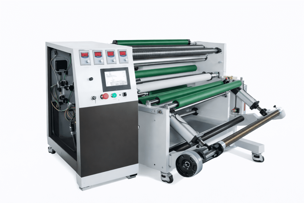 원단/필름 롤을 지정 폭으로 절단하고 재권취하는 슬리팅 리와인더 장비입니다.