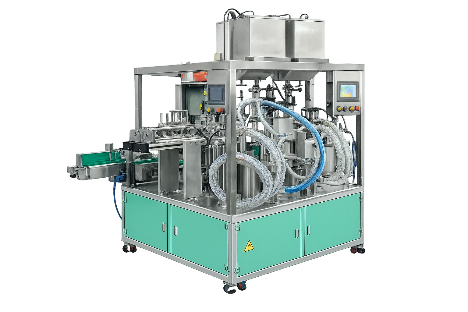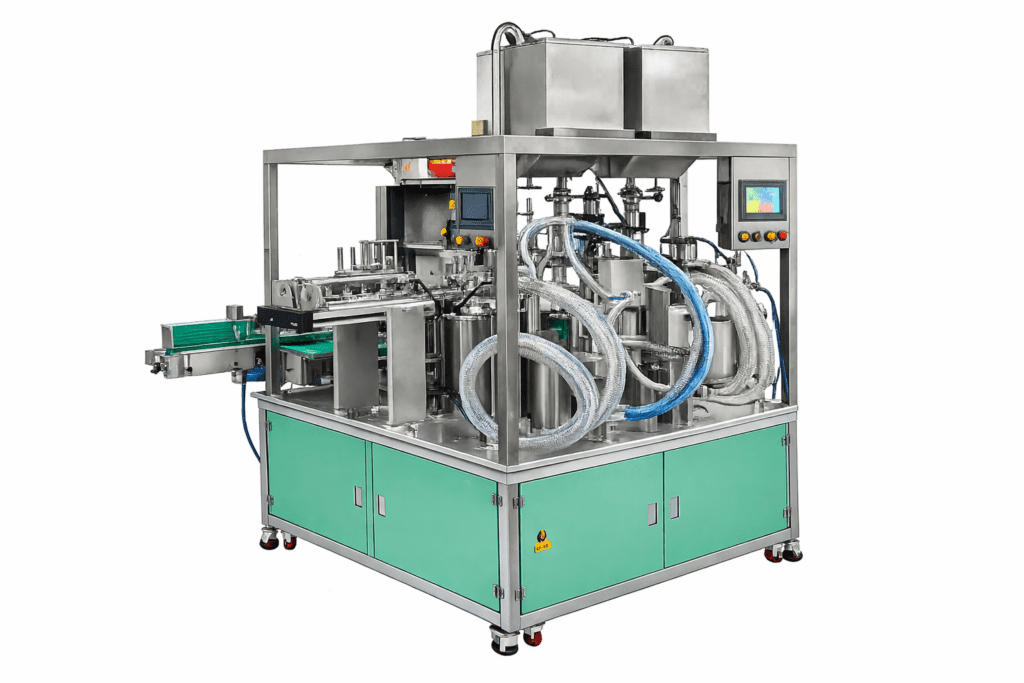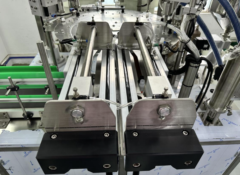 스파우트 파우치 홀더는 회전식 테이블에 장착되어 있으며, 각 홀더는 파우치를 안전하게 고정하면서도 충전 후 쉽게 분리할 수 있도록 설계되었습니다. 316 스테인리스 스틸로 제작되어 내구성이 뛰어나며, 파우치의 넥 부분을 정확하게 잡아주는 구조로 충전 중 누수나 오염을 방지합니다.