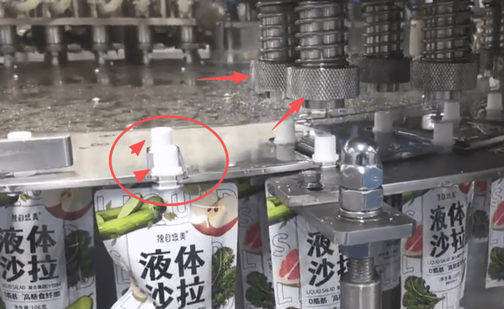 자동 진동 디스크(진동 보울 피더)는 캡을 자동으로 정렬하고 공급하는 핵심 장치입니다. 캡을 정확한 방향으로 정렬하여 자동 캡 장착 공정으로 공급합니다. 무캡 정지 보호 시스템 본 설비의 가장 중요한 안전 기능 중 하나는 무캡 정지 보호 시스템입니다. 이 시스템은 캡이 없는 상태에서 자동으로 기계를 정지시켜, 캡이 없는 파우치에 원료가 충전되어 생산 라인으로 흘러나가는 것을 방지합니다.